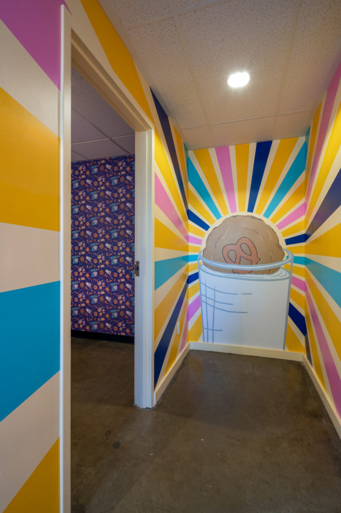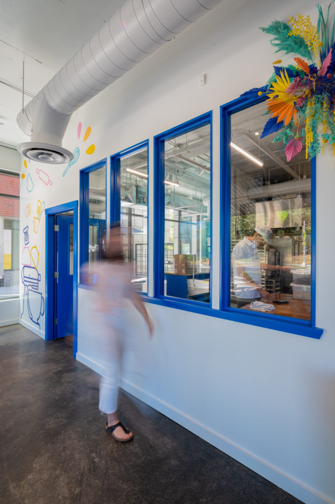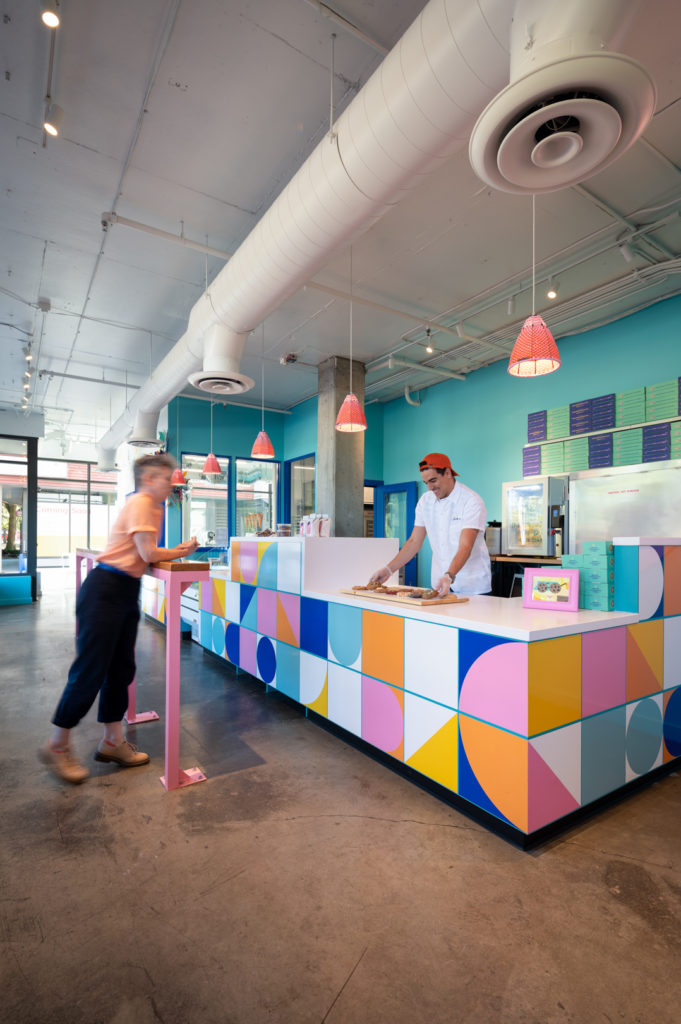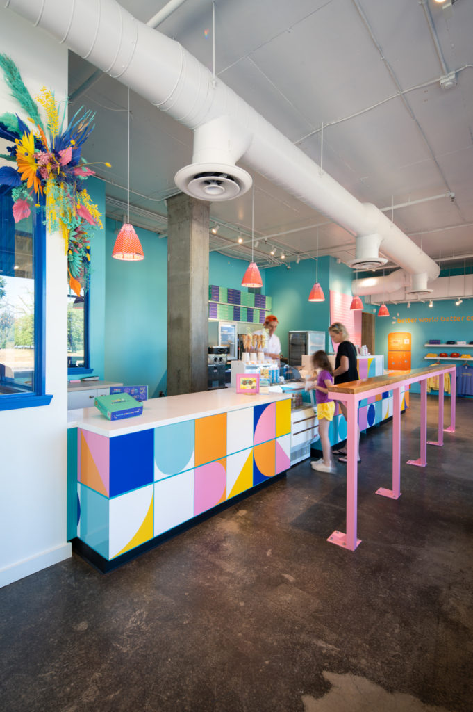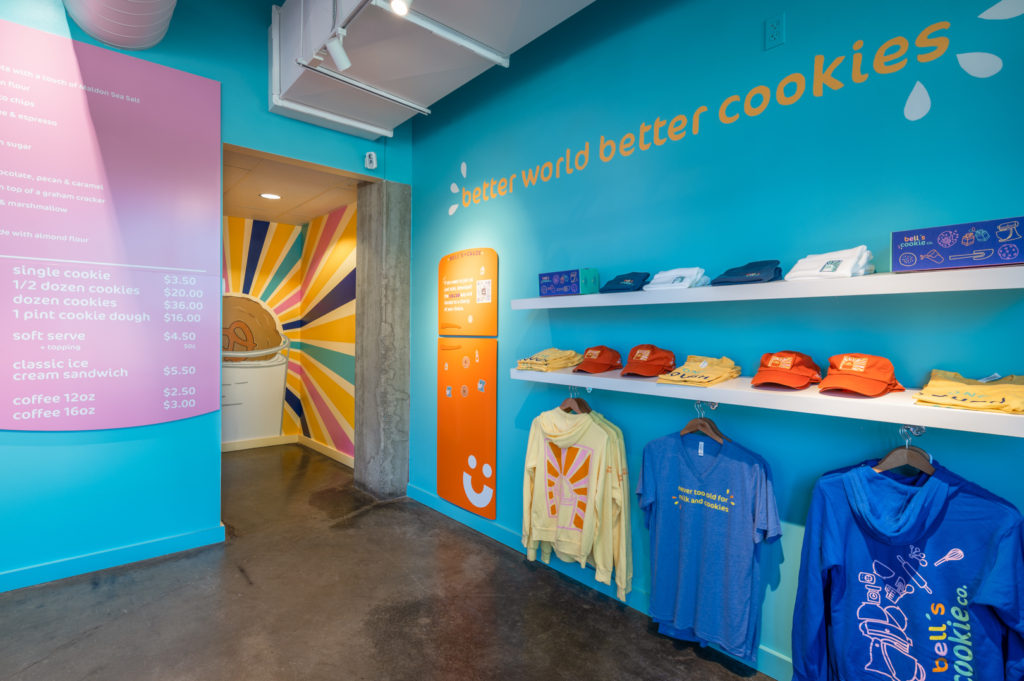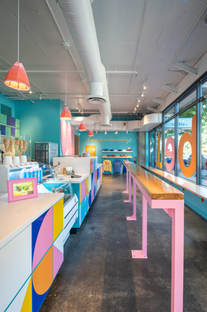 Welcome to Bell’s Cookie Co! This delightful local bakery is located in the Greenlake neighborhood, right across from the park. Bell’s is a burst of color and pattern, with custom lights, fun murals and large windows that gaze into the baking areas behind the counter.
