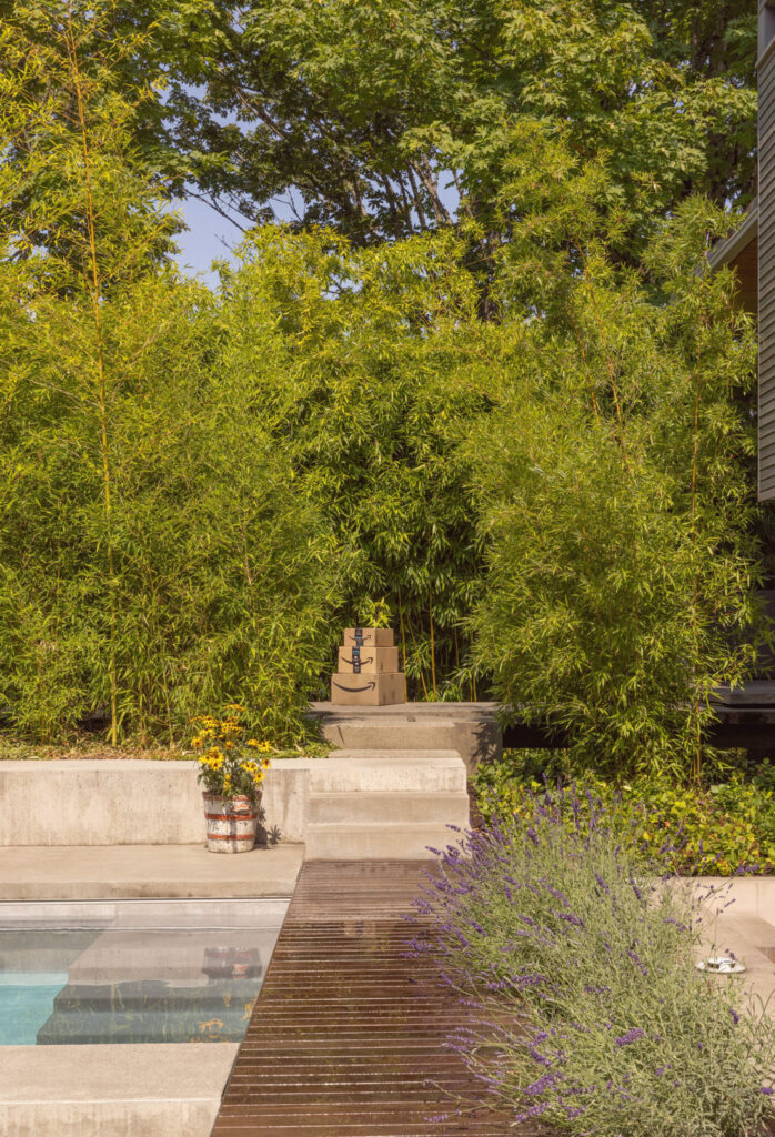 In collaboration with Best Practice, additional artwork was commissioned and strategically placed around the yard. At the corner of the patio is a custom bronze water feature created by Northwest artist Jeffry Mitchell. With soothing sounds of trickling water, “Bill’s Fountain” depicts a fantastic animal in the tradition of Koma Inu, or Fu Dogs. At the yard’s entry walkway, a piece from Mungo Thomson’s “Snowman” series depicts stacked Amazon boxes painted in bronze—a cheeky commentary on the ephemerality of consumption.