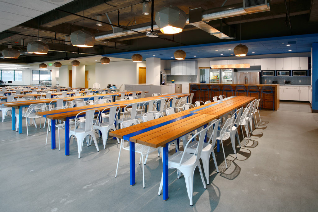 Best Practice designed this office space for a growing Seattle tech company that wanted their all hands meeting to feel like “a giant picnic.” Using this as a jumping off point, Best Practice designed custom picnic tables for their large gathering space, cozy huddle work zones, lounges and collaboration areas to facilitate all types of working. Using bright blues and pops of other colors, the large office became more intimate, and allowed for all types of informal work spaces.